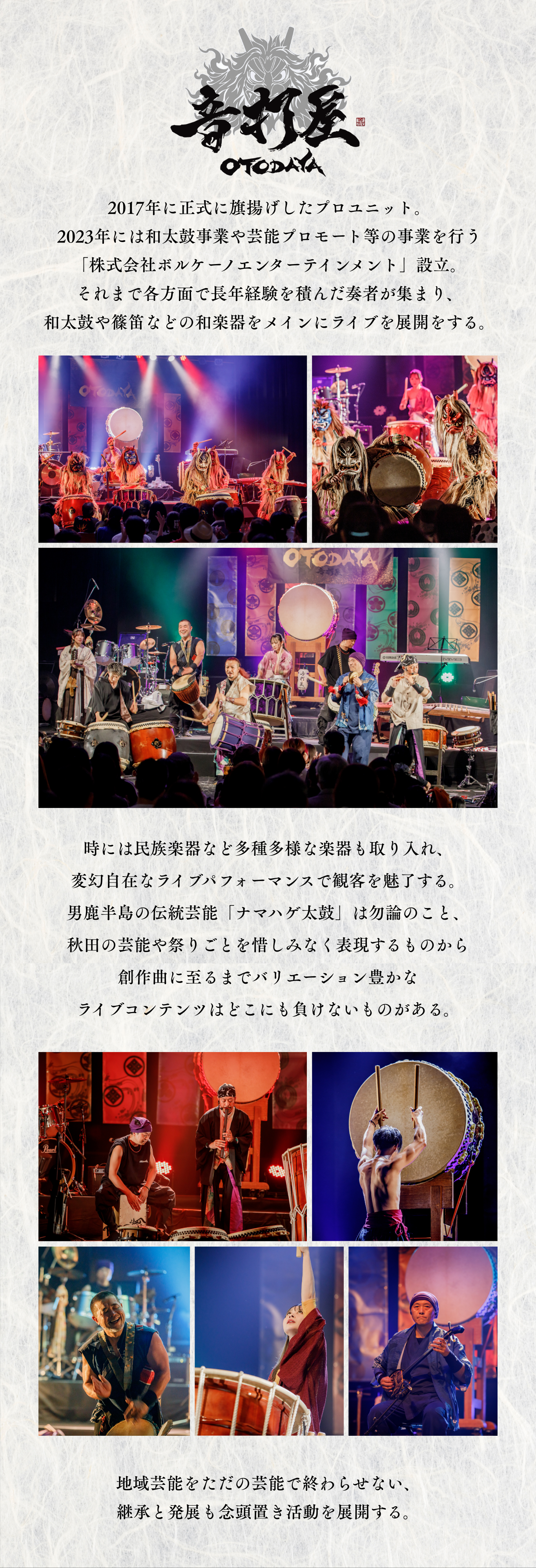 | 沿革 | ・2017年 「Akita和太鼓パフォーマンスユニット音打屋-OTODAYA-」始動 ・2023年 「株式会社ボルケーノエンターテインメント」設立 |